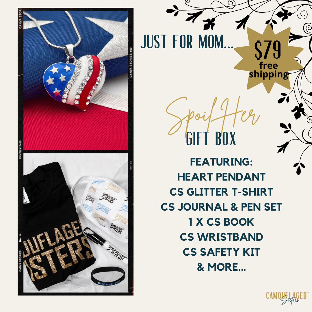 Happy Mother’s Day to all the Mommas in combat boots! All month long we are celebrating YOU! The Spoil Her Box will make you feel special and know that you are appreciated for your service, dedication, and sacrifice! This beautiful box features a beautiful flag heart pendant, a Camouflaged Sisters glitter t-shirt, a Camouflaged Sisters book, a Camouflaged Sisters journal and pen set, a Camouflaged Sisters safety kit (face mask & hand sanitizer), and more. Moms, You deserve it all! You give so much to the military and everyone else, we want to celebrate YOU! FREE Shipping all month long!